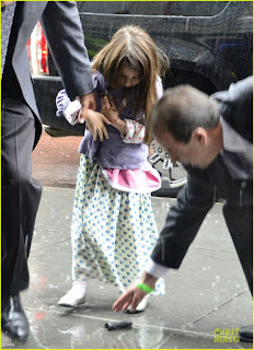 Suri Cruise drops a toy in the rain as she heads to the set of "Oblivion" to visit her daddy