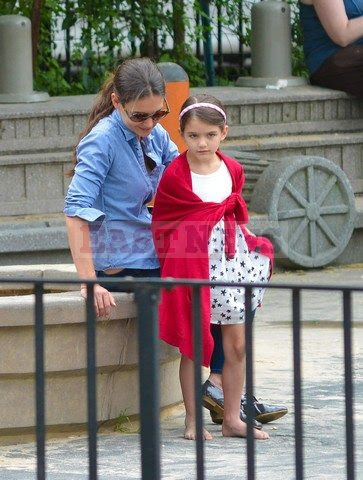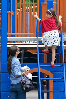 Katie Holmes and Suri Cruise take advantage of the last days of summer and spend mother-daughter time in a park in Dumbo, Brooklyn, New York today. On a rare occasion Katie was wearing her hair down whilst Suri was playing on the slide. Suri then ended up sharing a swinging tyre with some other youngsters and had a blast. Katie did had to help out though when Suri wanted all the sand wiped off from her feet.